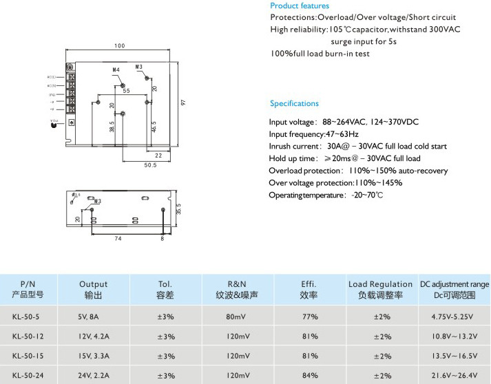 高可靠性:105C長壽命電容,能承受300VAC輸入電壓5秒不損壞 100滿載老化測試 輸入電壓:88-264VAC124-370VDC 輸入頻率:47~63Hz 沖擊電流:30A@-30VAC滿載冷態(tài) 保持時(shí)間:≥20ms@230VAC滿載 過載保護(hù):110%-150%自動恢復(fù) 過壓保護(hù):110%~145% 運(yùn)行溫度:-20-70℃" />